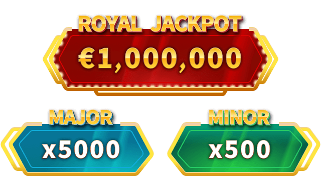 Royal Jackpot: €1,000,000 (or equivalent value in your currency). Major Jackpot: x5000 your bet. Minor Jackpot: x500 your bet.